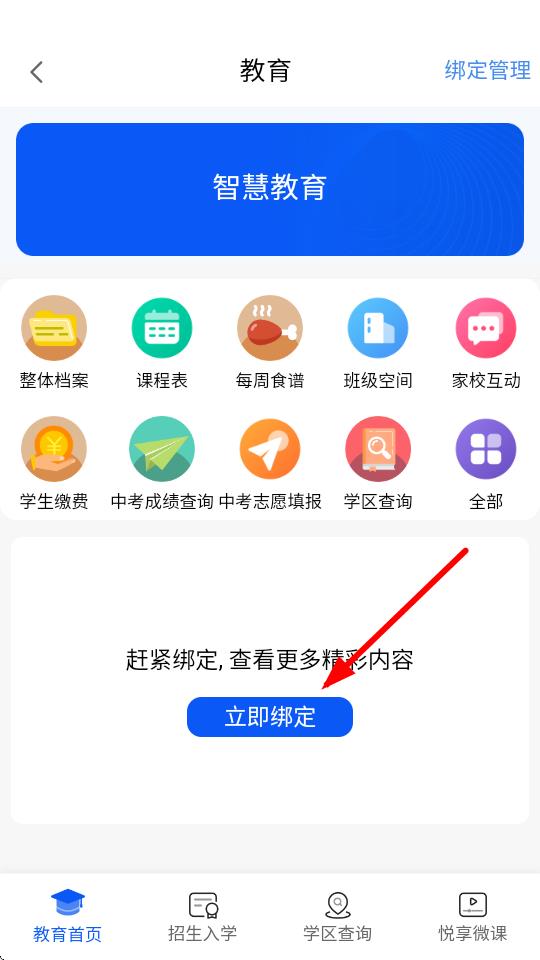 3、進(jìn)入教育頁(yè)面后,點(diǎn)擊立即綁定按鈕,進(jìn)入綁定賬號(hào)頁(yè)面。