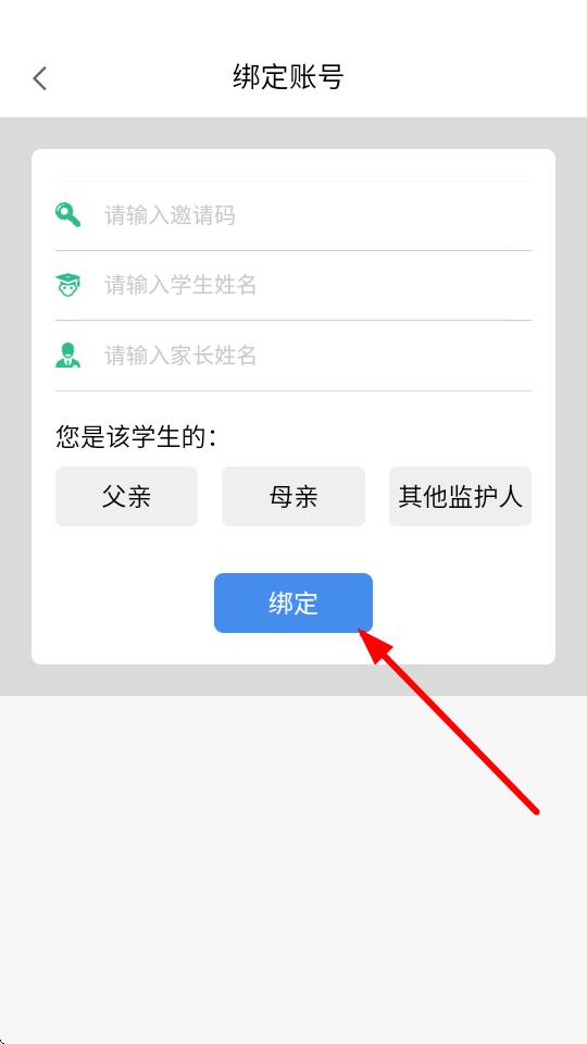 4、在綁定賬號(hào)頁(yè)面,依次輸入邀請(qǐng)碼、學(xué)生姓名、家長(zhǎng)姓名,選擇與學(xué)生的關(guān)系,最后點(diǎn)擊綁定按鈕完成綁定。
