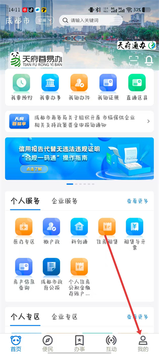 1、打開天府蓉易辦APP,點(diǎn)擊我的選項(xiàng)。