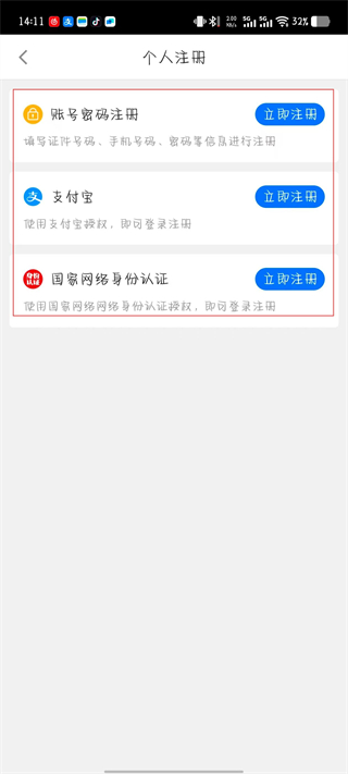 4、在個(gè)人注冊頁面選擇注冊方式,即可注冊。