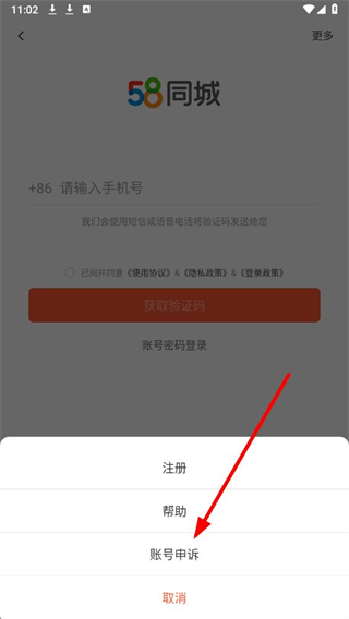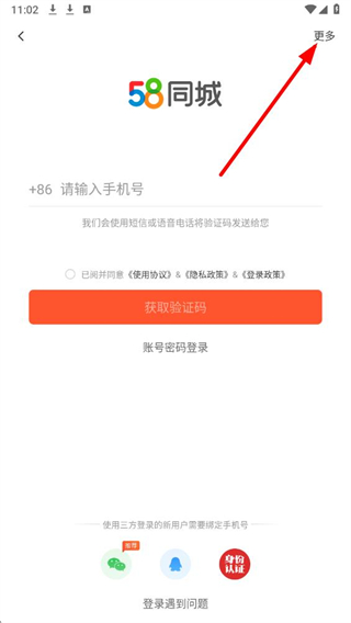 1、在58同城登錄界面中,點擊右上角更多選項,可展開更多操作選項。
