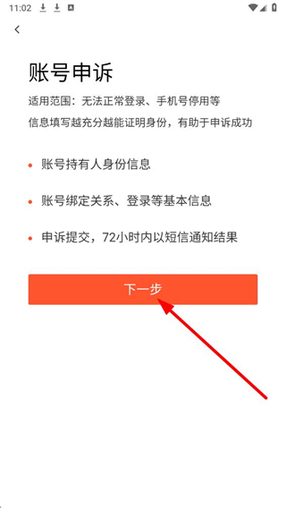 3、在賬號申訴頁面,閱讀適用范圍與信息要求后,點擊下一步按鈕,進入賬號確認環(huán)節(jié)。