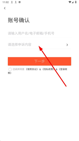 4、在賬號確認頁面,輸入賬號相關(guān)信息并選擇申訴內(nèi)容,勾選協(xié)議后,點擊下一步即可繼續(xù)申訴流程。