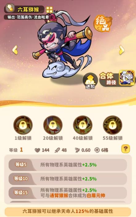 1、六耳獼猴每攻擊三次觸發(fā)被動(dòng)召喚隨心鐵桿兵砸地造成150%范圍傷害觸發(fā)穩(wěn)定適合前中期清理小怪彌補(bǔ)隊(duì)伍范圍輸出不足。