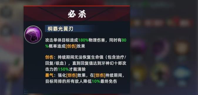 1、爆氣機制獨特目標怒氣高于自身時可獲爆氣并得重拳效果,必殺技攻擊單體目標造成物理傷害高概率施加創(chuàng)傷效果使目標無法恢復生命,直至恢復值達自身攻擊力150%才清除。
