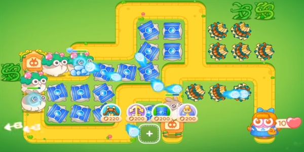 1、開局需在中間位置快速放置船錨炮塔,它能有效克制木偶和兔子敵人,第一波敵人出現(xiàn)立即將其升至2級提升輸出,第二波在中間區(qū)域補充多重箭塔,助力快速清理障礙物和敵人。