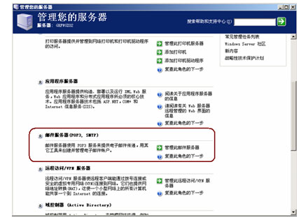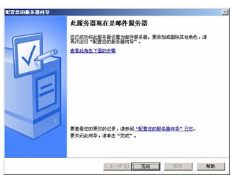 (7)完成文件復(fù)制后系統(tǒng)會自動打開如圖49所示向?qū)瓿蓪υ捒?。直接單?ldquo;完成”按鈕完成郵件服務(wù)器的整個安裝過程。完成后執(zhí)行【開始】→【管理工具】→【管理您的服務(wù)器】菜單操作,在打開的如圖50所示“管理您的服務(wù)器”窗口即可見到剛才安裝的郵件服務(wù)器了。單擊“管理此郵件服務(wù)器”即可打開郵件服務(wù)器窗口,如圖所示。