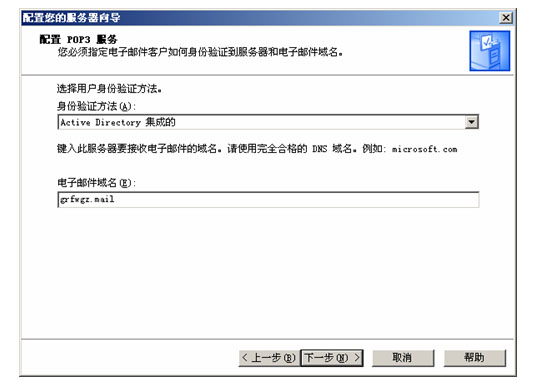 (4)單擊“下一步”按鈕,打開如圖所示對話框。在其中要求選擇郵件服務(wù)器中所使用的用戶身份驗(yàn)證方法,一般如果是在域網(wǎng)絡(luò)中,選擇“Active Directory集成的”這種方式,這樣郵件服務(wù)器就會以用戶的域帳戶進(jìn)行身份認(rèn)證。然后在“電子郵件域名”中指定一個郵件服務(wù)器名,本示例為grfwgz.mail。